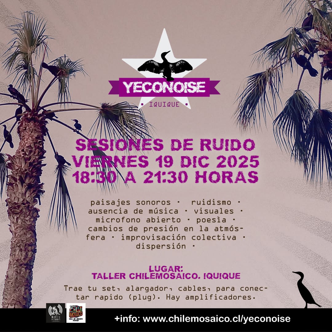 YECONOISE 🔊 7ma Sesión de Ruido / Visuales / Poesía ¿Eres ruidista, artista visual o poeta? Abrimos nuestro espacio para una sesión experimental colaborativa. 📅 19 de diciembre ⏰ 18:30 – 21:30 hrs (cierre puntual) 📍 Taller Chilemosaico 🎤 Micrófono abierto para poesía y experimentación sonora. Gratuito, sin previa inscripción, sin ensayos, sin auspiciadores, ni... ...