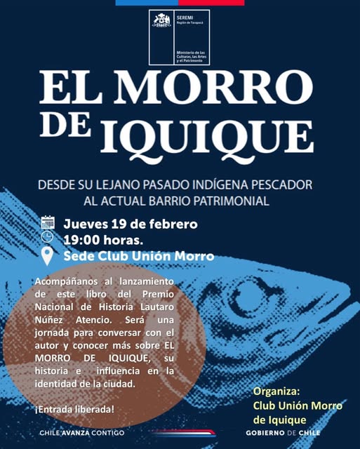 ✨ LANZAMIENTO DEL LIBRO ✨ “EL MORRO DE IQUIQUE” Desde su lejano pasado indígena pescador al actual barrio patrimonial En el marco de las actividades del Carnaval Morrino, el Club Unión Morro, a través de su actual directiva, tiene el agrado de invitar a la comunidad a participar de este importante hito cultural: el lanzamiento... ...