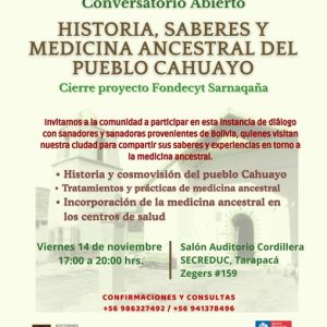 La Sección Regional de Tarapacá de la Subdirección Nacional de Pueblos Originarios y Tribal Afrodescendiente chileno, en conjunto con la Municipalidad de Huara, realizarán el Taller de Transmisión de Prácticas y Conocimientos en Torno a la Medicina Indígena. Esta instancia consta de cuatro sesiones, cada una de ellas se desarrollará en distintas localidades para contar... ...
